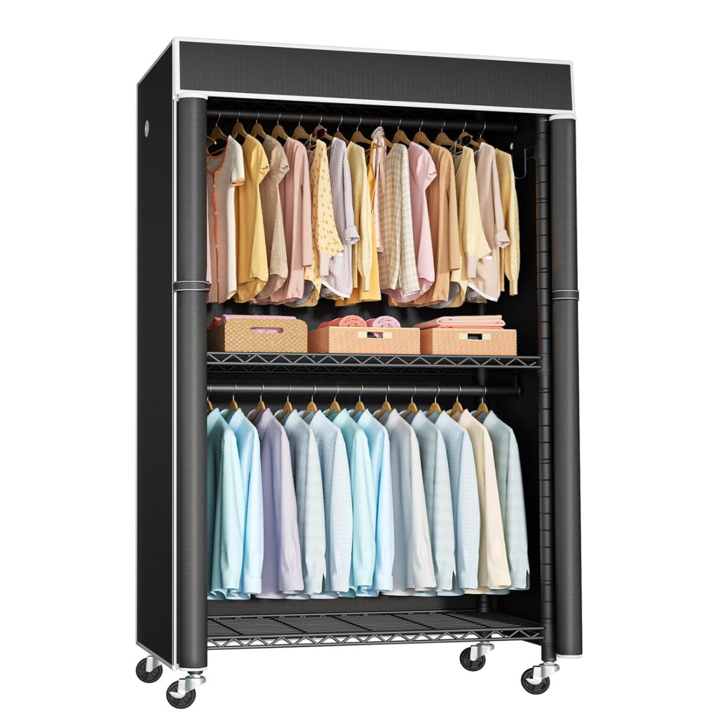 Clothing Rack with Cover, P1C Rolling Closet Rack with Wheels, Metal Garment Rack for Hanging Clothes, Clothing Storage Wardrobe with Cover, 36.2″W x 16.5″D x 80.5″H, Black, Load 450 Pounds